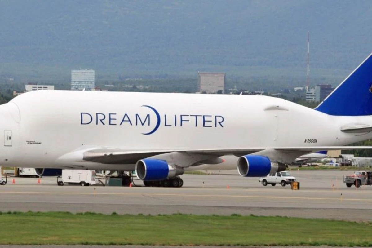Bentuk pesawat ini besar dan tinggi sesuai dengan gambar pesawat kargo Boeing 747 Dreamlifter di atas.